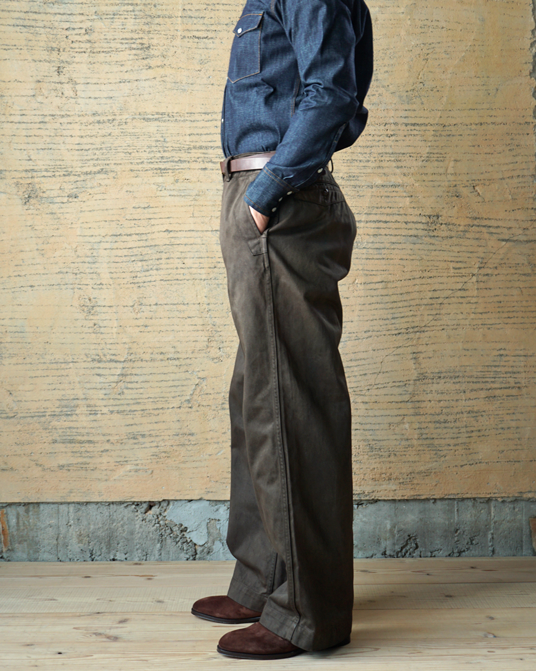 ワタリから裾にかけてストンと落ちるワイドシルエット。股上が深く、ハイウエスト。