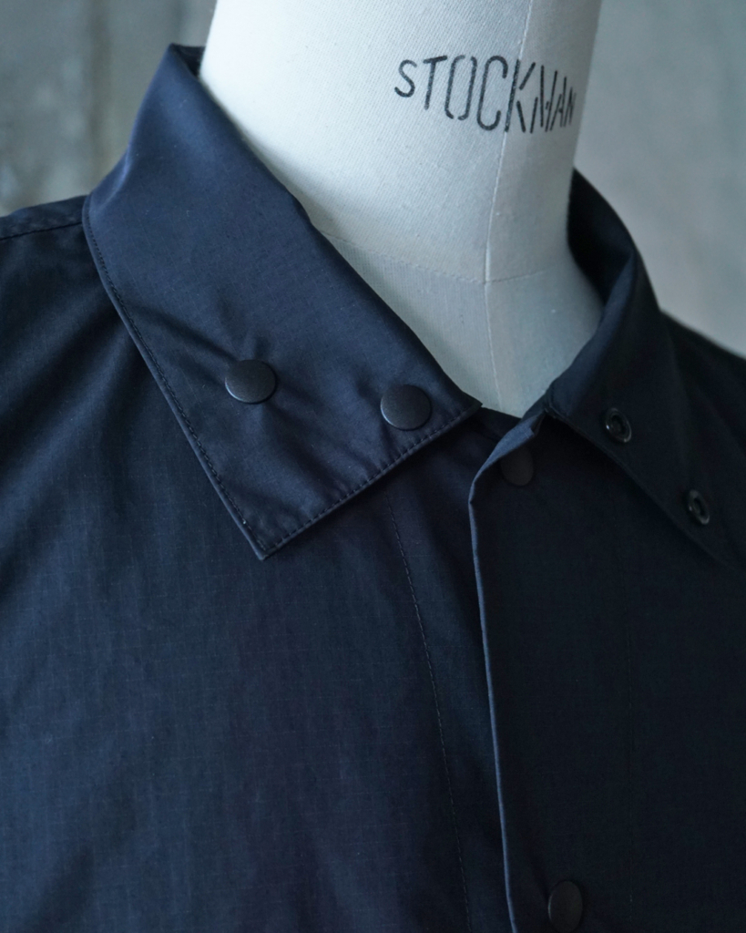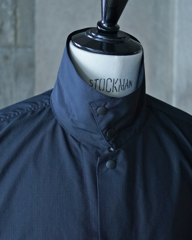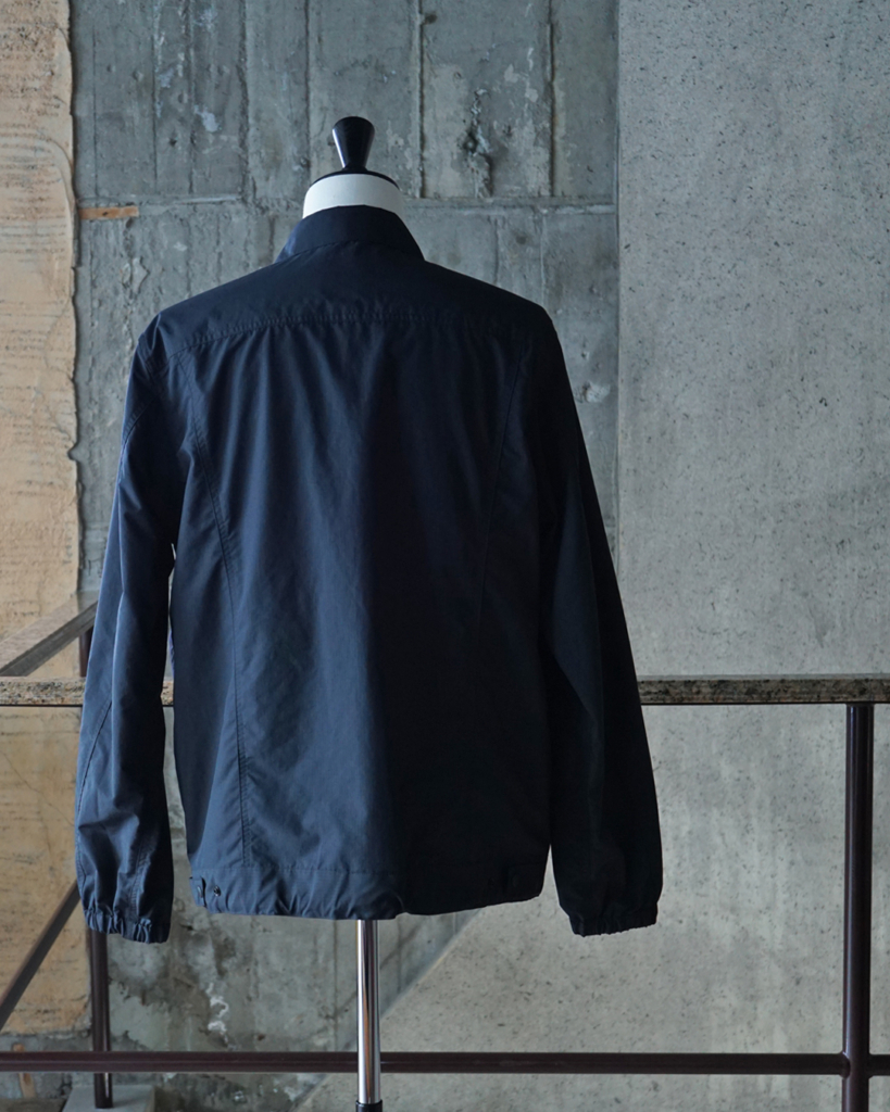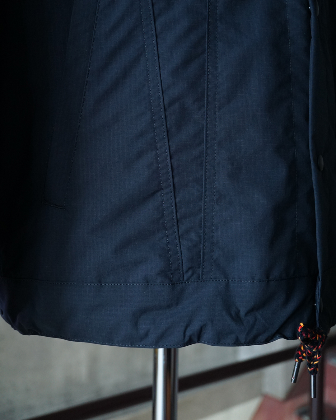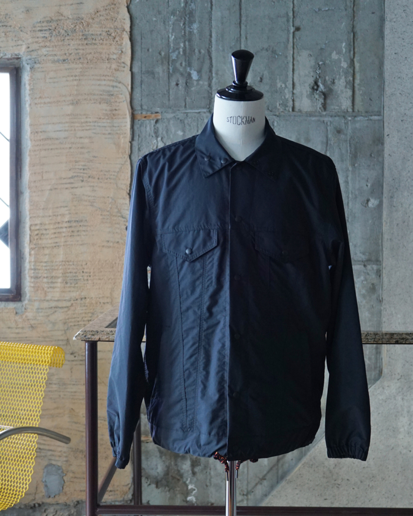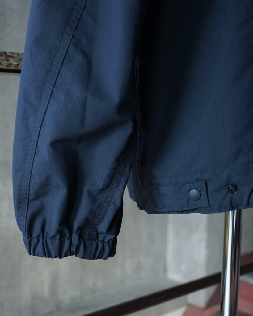 デニムジャケットのデザインをベースに、軽量のリップストップ生地でボタンはスナップボタンを採用。袖先はゴム仕様で、ウエストにはドローコードを施し、ワークではなくアクティブな印象に。