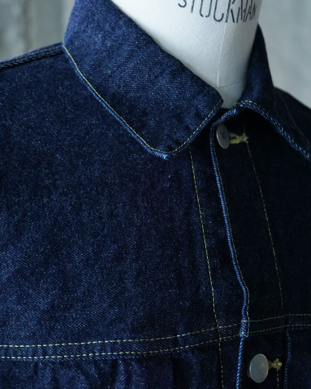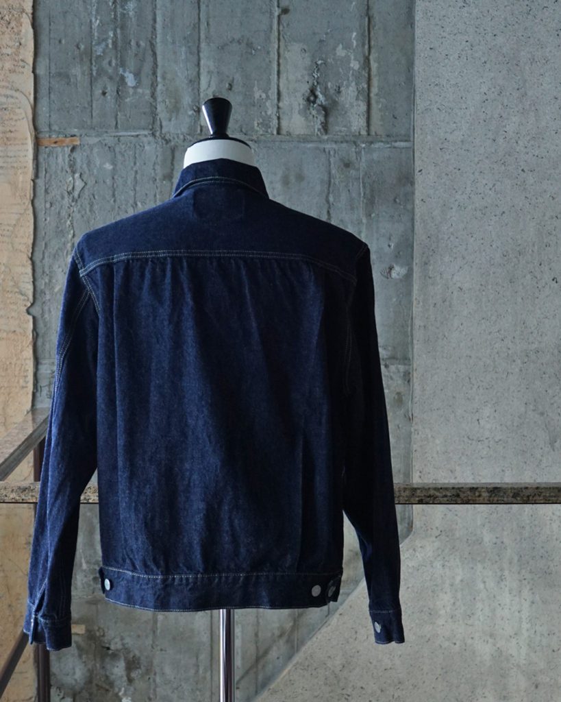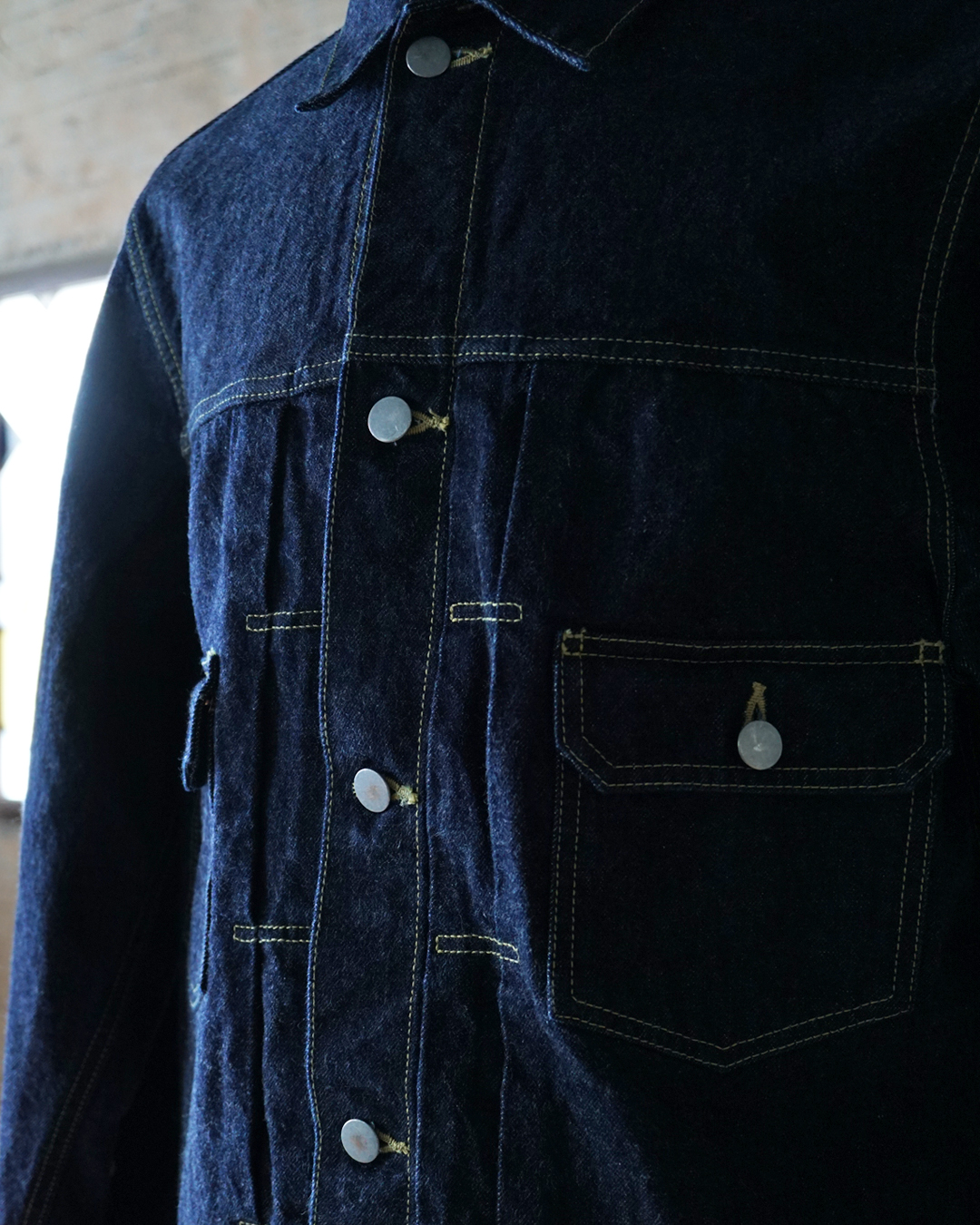 生地の原料となる原綿はアメリカ製のものを使用し国内で紡績工程を経て旧式のシャトル織機でデニム生地を織り上げています。生産性こそ現代の織機には劣りますが、独特の凹凸がある味わい深い表情のデニム、1940年代後半から50年半ば頃のビンテージデニム同等の生地を再現。