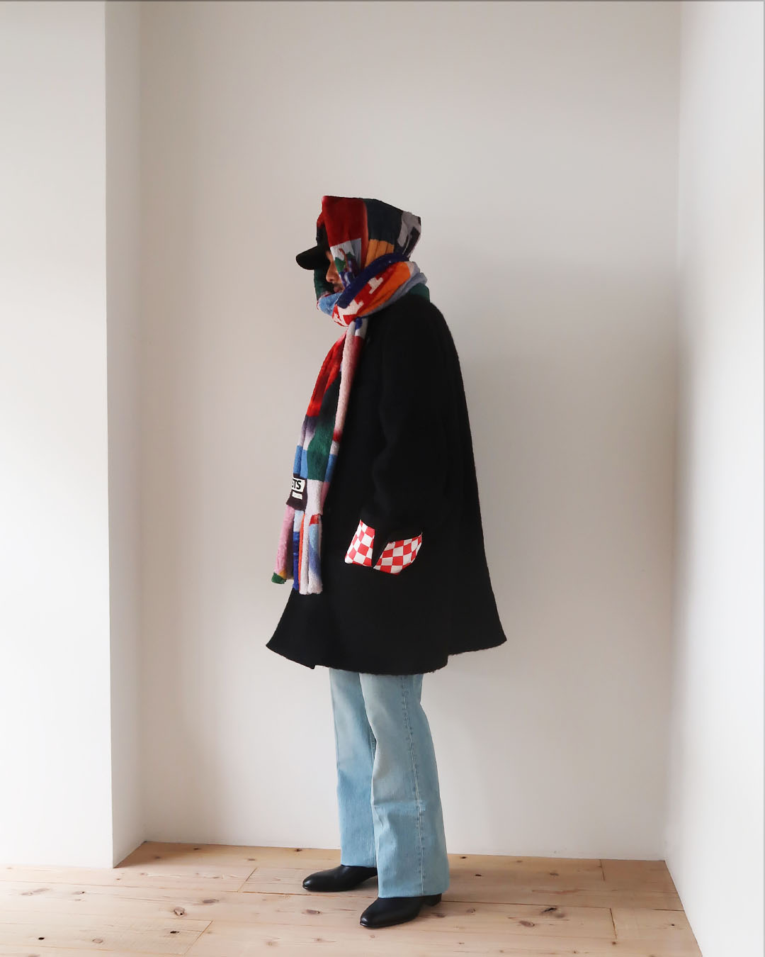 シンプルに巻くだけでインパクト大。長さがあるので頭に巻いて防寒対策もバッチリです。