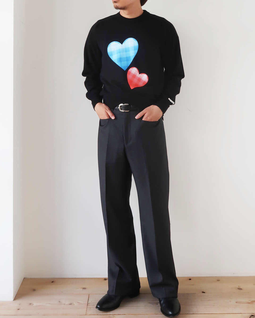 天邪鬼に、この“ふざけた”(良い意味で)ニットを合わせて、真面目なのか不真面目なのか分からないようなイメージでコーディネートしてみたいですね。
