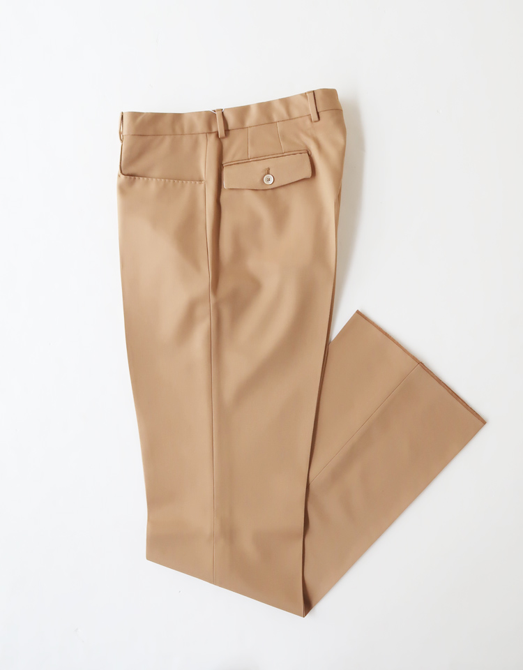 私的には何となくベージュのパンツって抵抗があるのですが、このパンツはトライしてみたいと思わせる魅力があります。良質なウールの質感のベージュは色気があり、どこか女性的なイメージ。野暮ったさが全くありません。