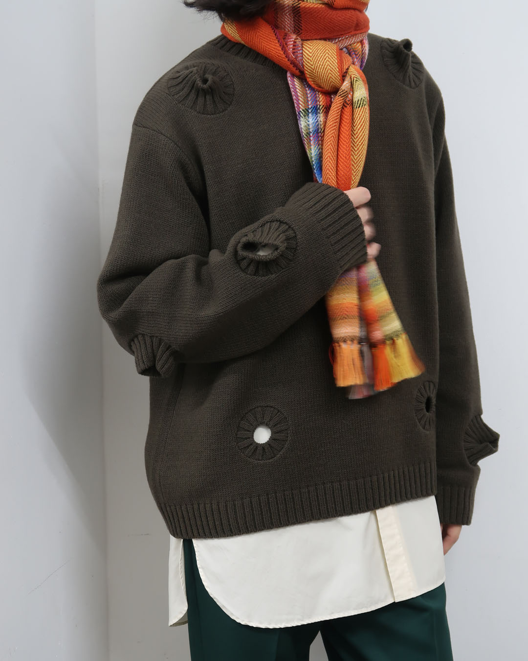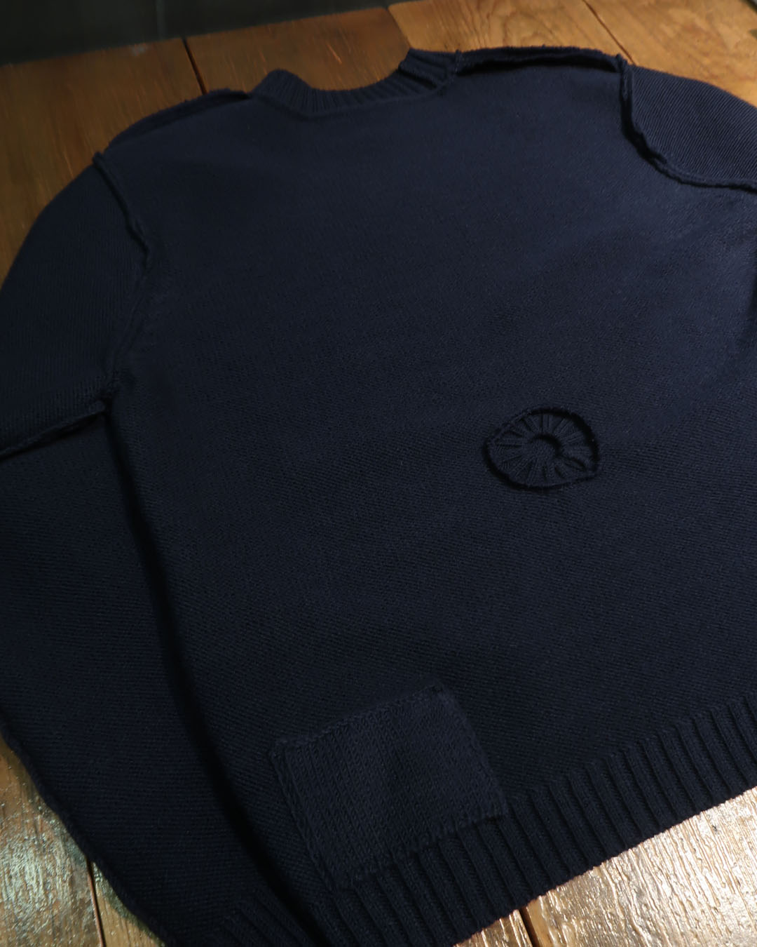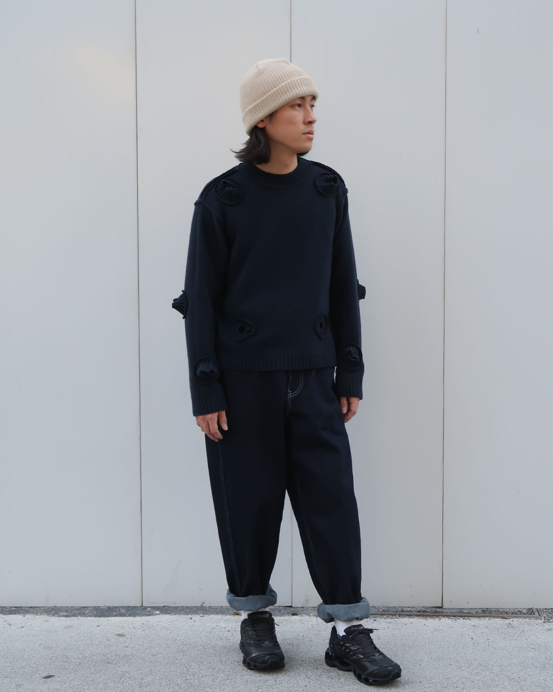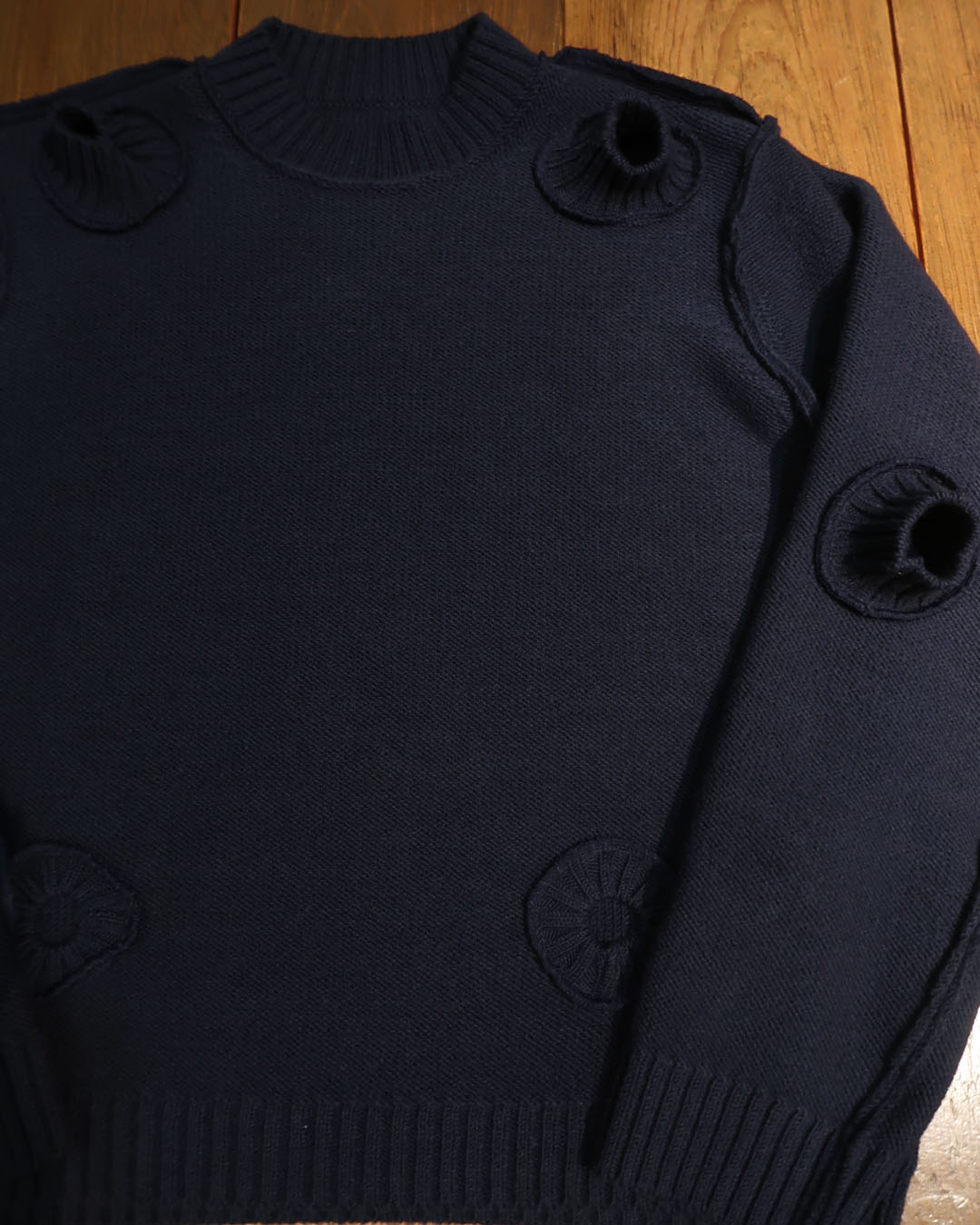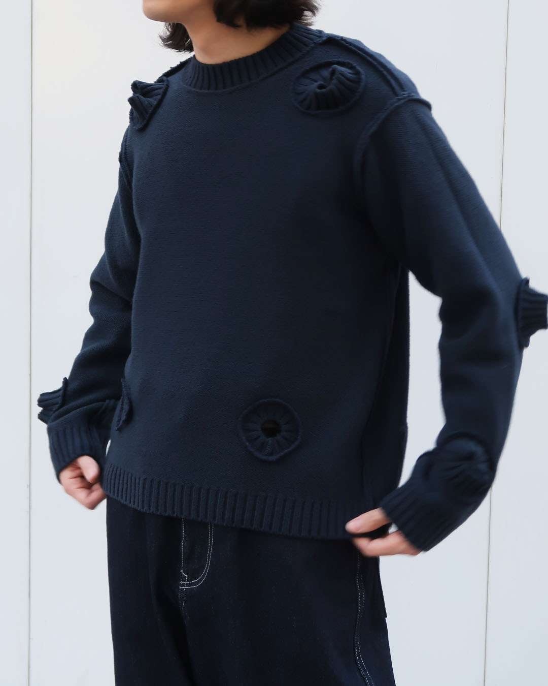 オーセンティックさとモダンさが程よく噛み合った面白いアイテム。リブの実用性は当然皆無ですが、ベースは一番手に取りやすいシルエットのセーター。