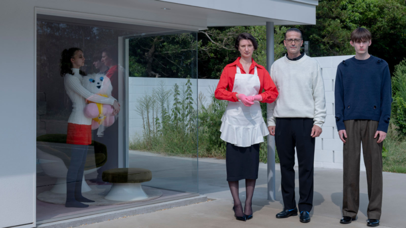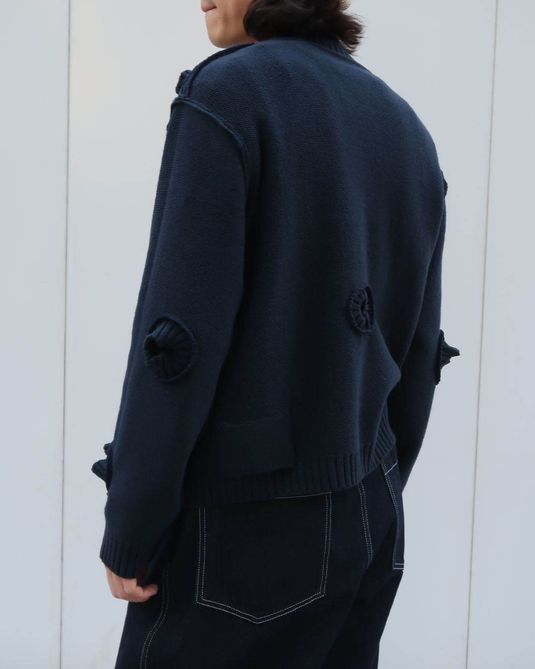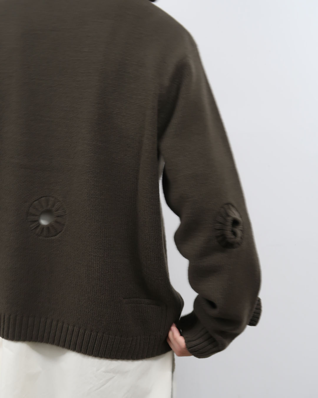 洋服を着るときに窄まる必要がある襟元、袖、裾に配される横編みの編み地でできたリブは着ているときに伸びてビヨビヨにならなければいいな、とくらいにしか考えることがありませんでしたが、こうしたリブを本来の用途ではなく、洋服のデザインに転用することで全く新しいものに見えます。