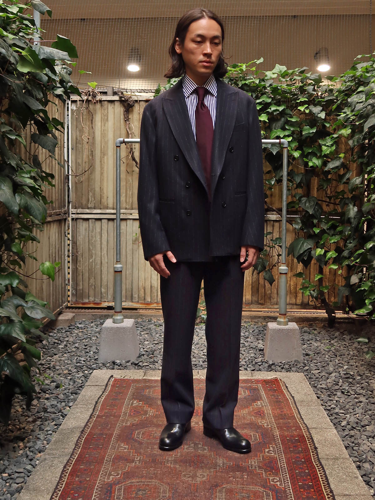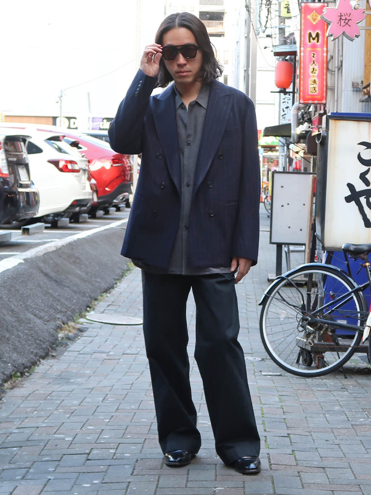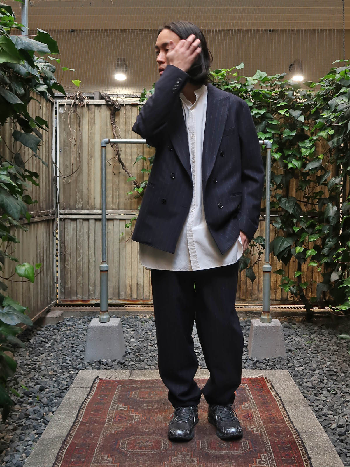 まずはフォーマルを意識したスーツのようなセットアップで。今シーズン初めて作られたドレス仕立てのシャツ”ANTHONY”を合わせたタイドアップスタイルです。ピークドラペルにノーベント、フラップなしのポケットという礼服調の仕様を取り入れつつ、ダーツが入らないボックスシルエットや長すぎない着丈、背抜き仕様などカジュアルな要素も併せ持っているので、どこか砕けたスタイルになります。