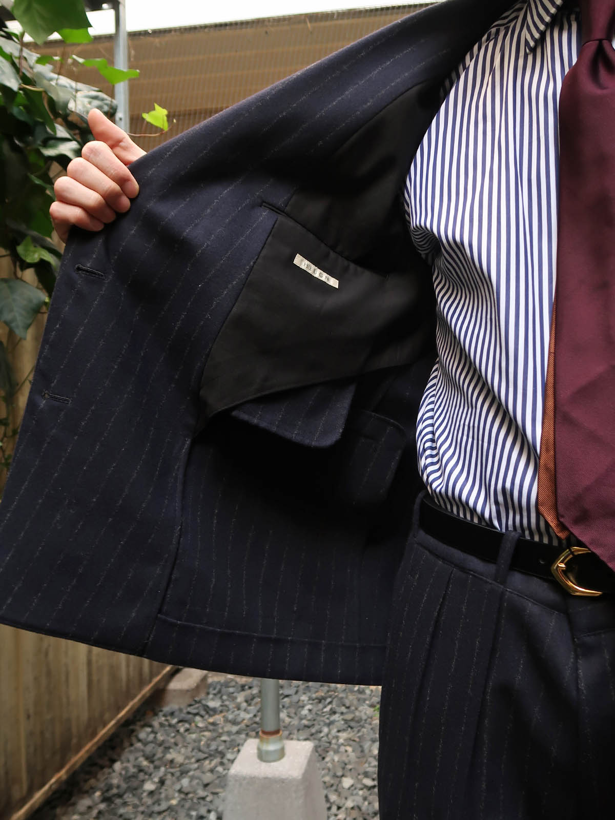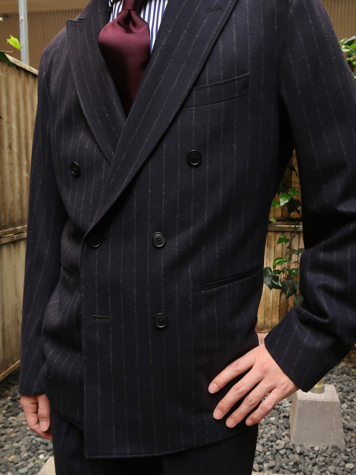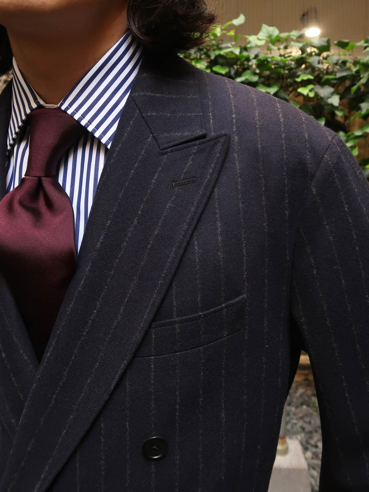 この生地は毛織物の産地として名高いイギリスハダースフィールド製の伝統的で独創的な高級服地を作り出す【SAVILE CLIFFORD】のスーツ地で、適度な硬さと膨らみがあるフランネルにクラシックなチョークストライプがとても英国調と言えます。