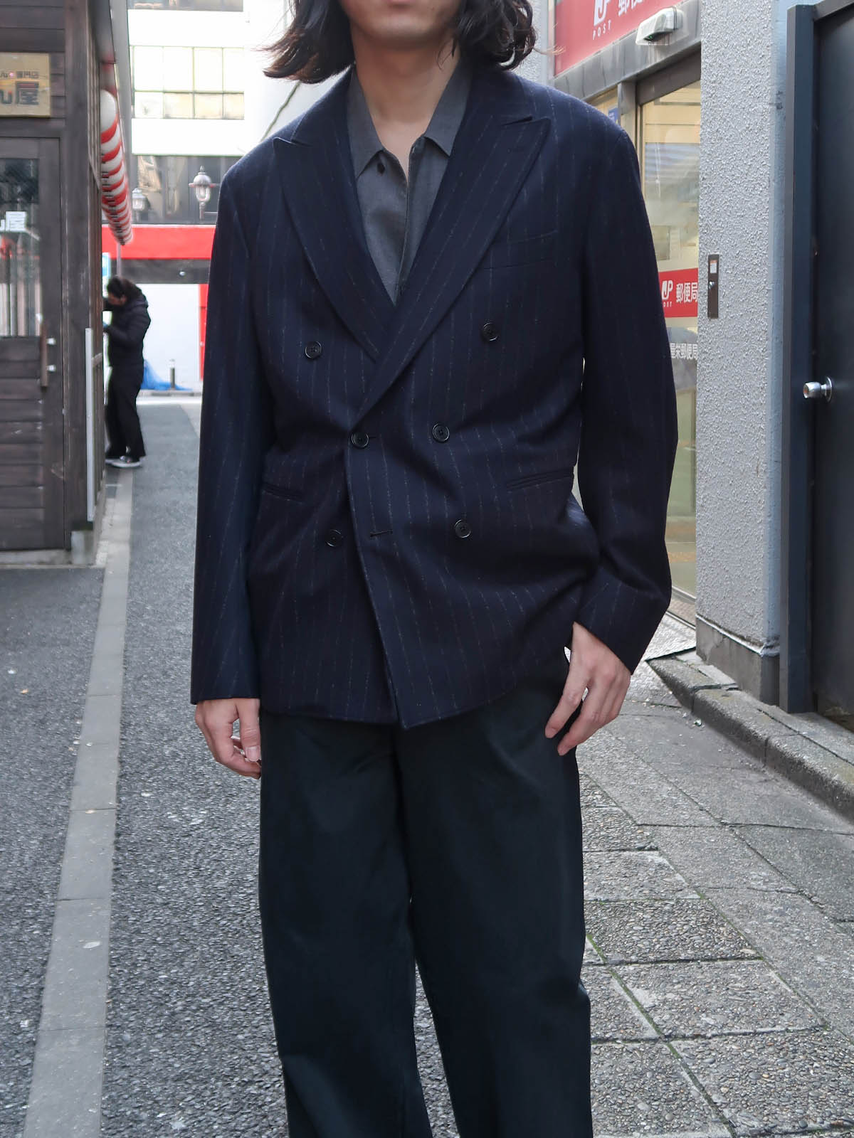 こちらはCOOPERとのセットアップ。ちょっとCOMOLIっぽいリラックス感のあるセットアップを楽しみたいときはこちらです。ジャケットはよく見るとPコートのようにどちらの合わせもできるようなボタンホールが切られています。もちろん内ボタンも2か所に付いているのですが、この仕様によりボタンを閉じなくても左右のバランスが対称で意外と新鮮なルックスです。
