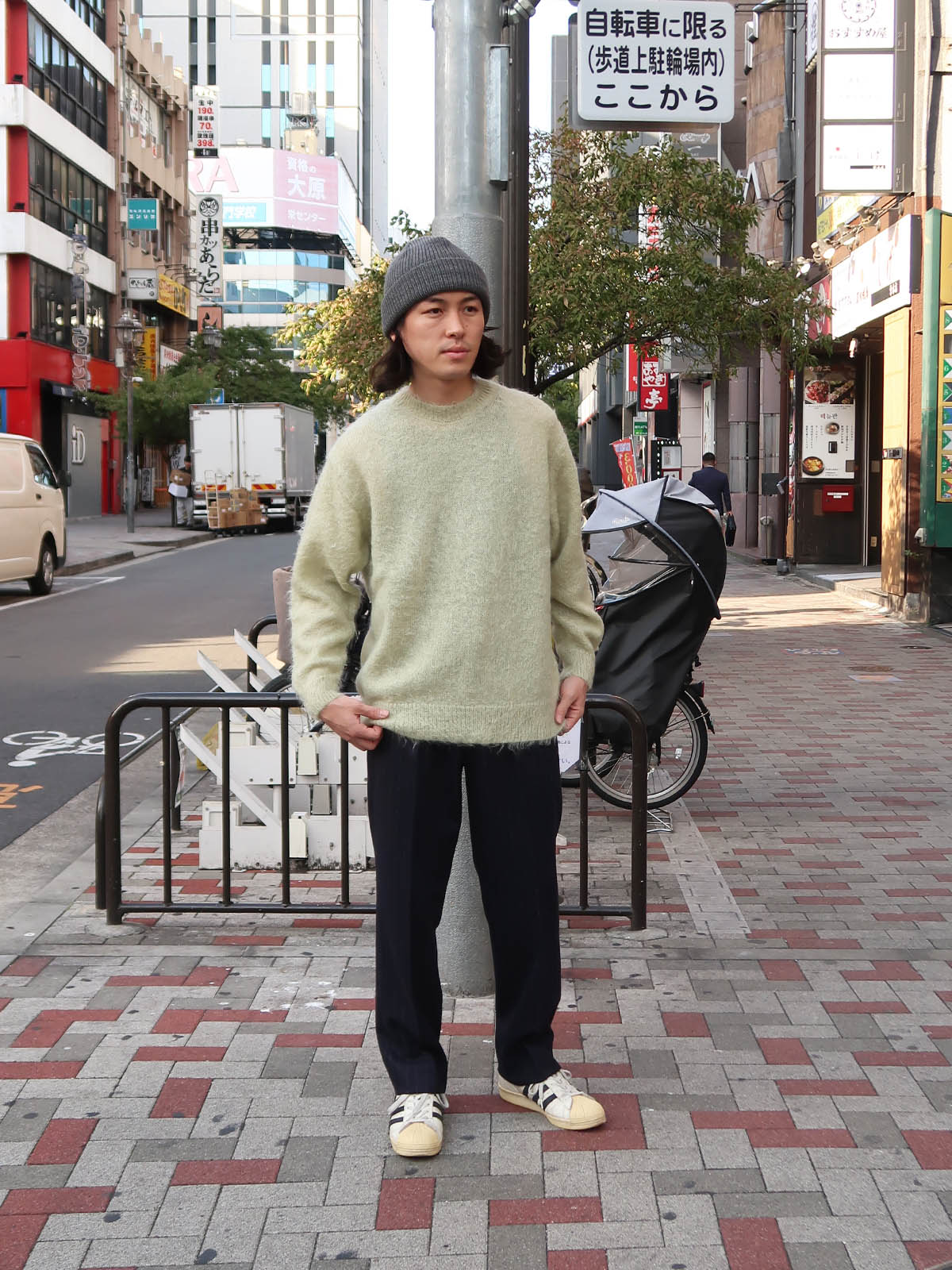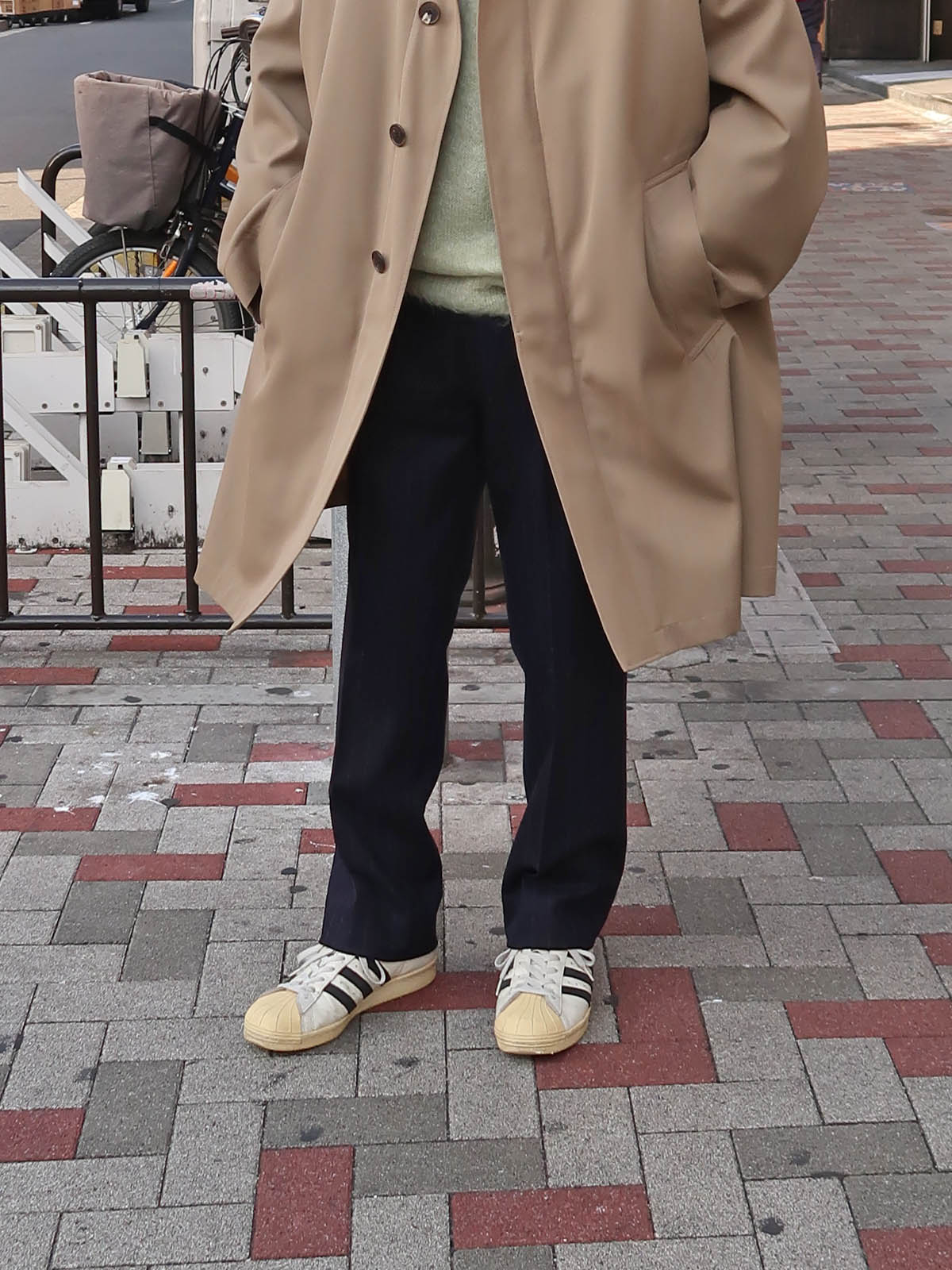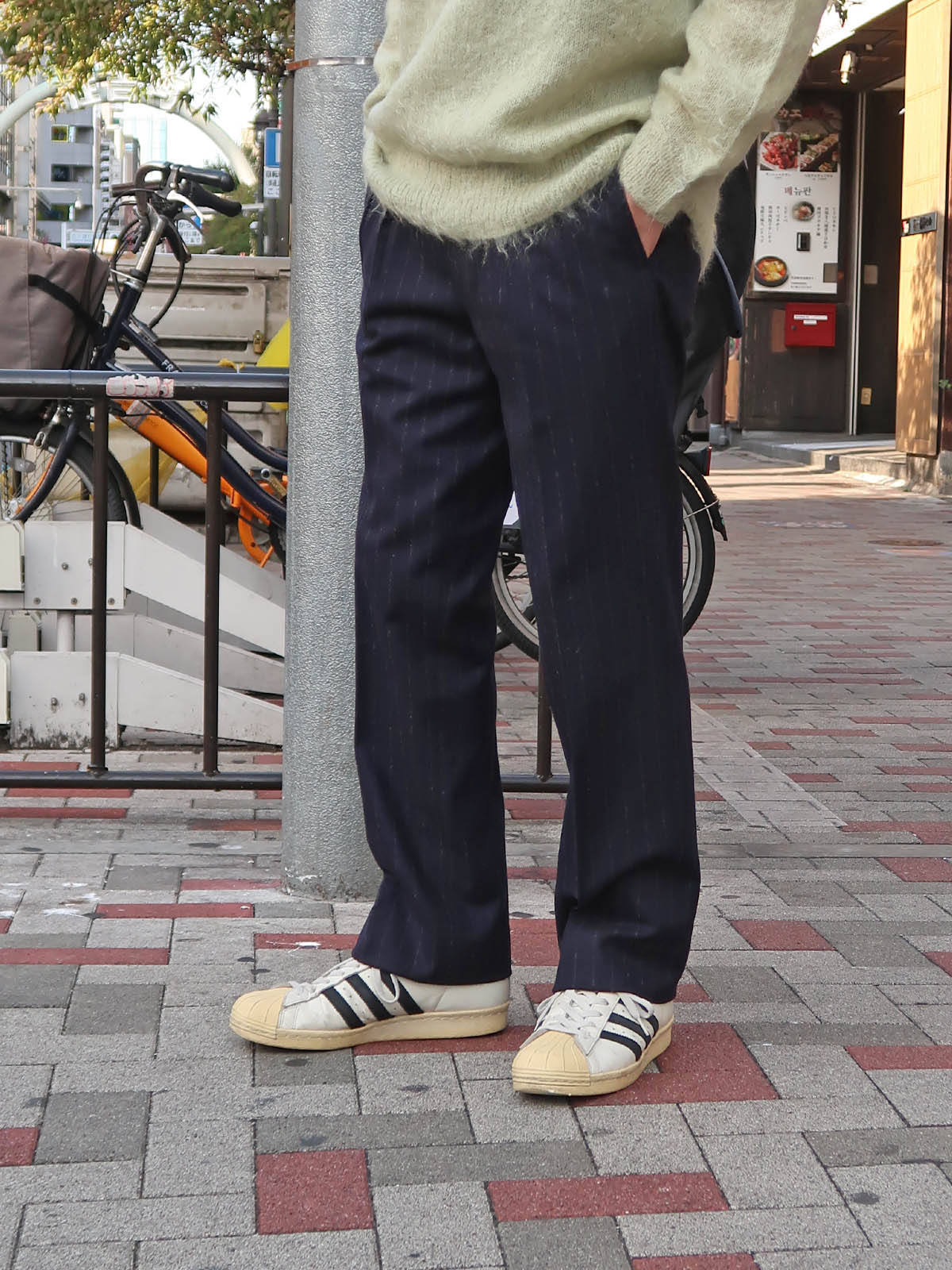 FREDDIEはそのシルエットの美しさから合わせるものを選びませんが、裾幅のバランスからスニーカーとの相性がいいので、靴から考えたスタイルです。ワイドピッチのストライプの迫力をいかして他は無地の合わせ、スニーカーの要素に合わせたカジュアルなニットや帽子のチョイスですが品が良く、そのままコートを羽織っても様になる汎用性の高さを誇ります。