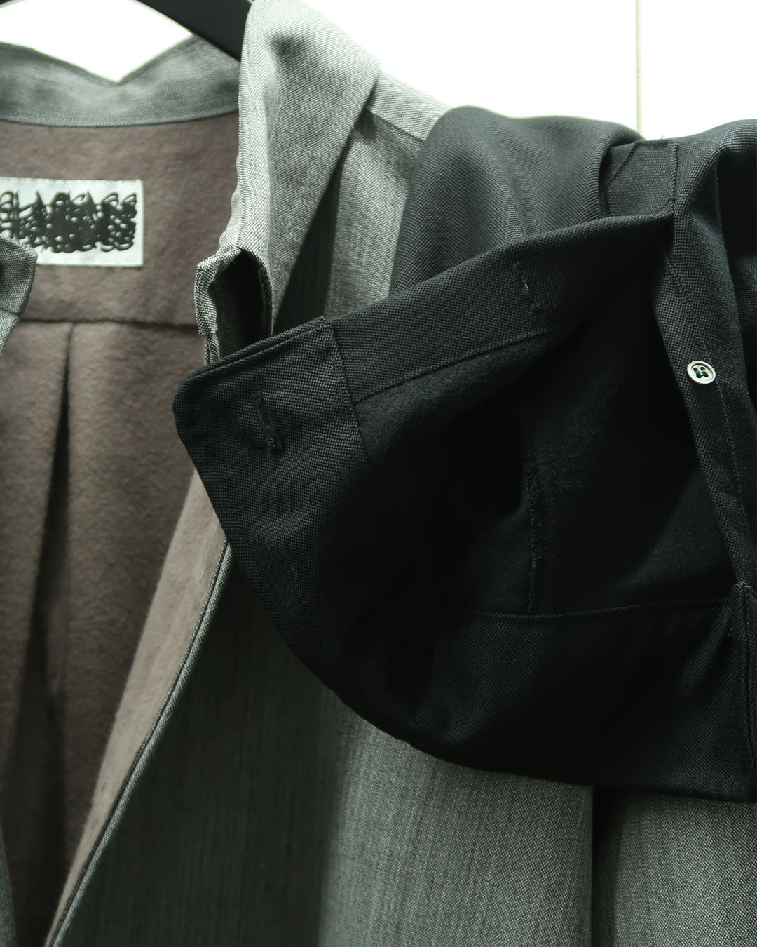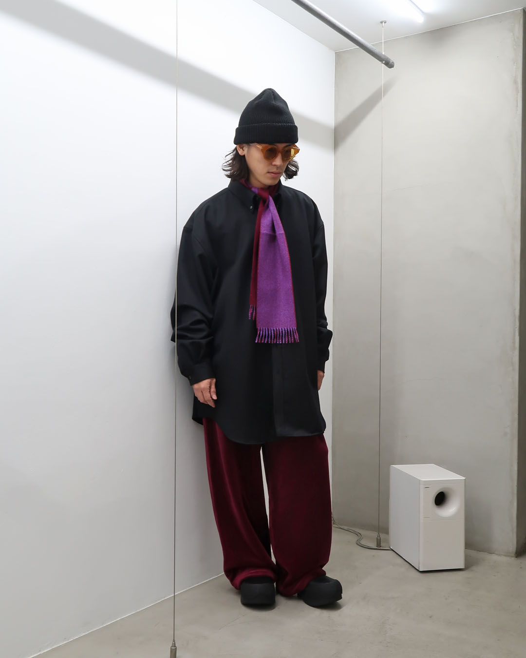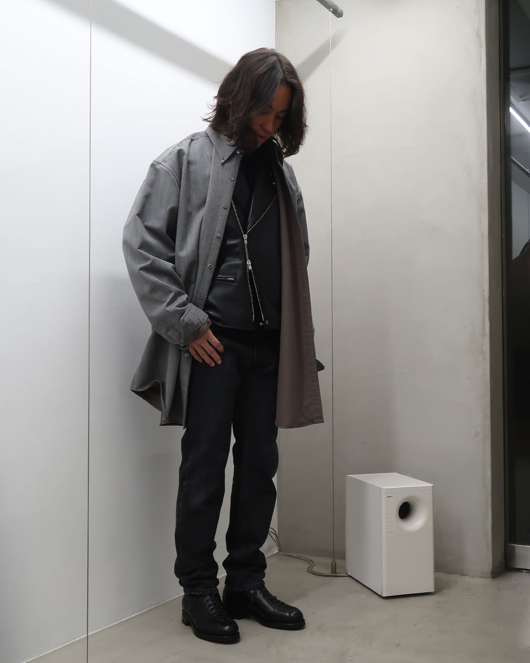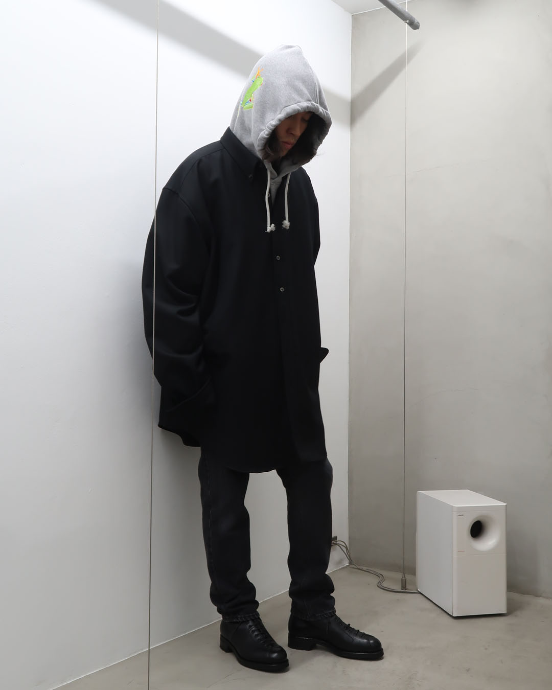 着用してみると、「大きめのシャツ」という言葉では到底おさまらないビッグサイズ。ここまで大きいと、もはやシャツという概念から飛び出していて、コートのような感覚になります。そんな印象もあって、私はこのアイテムを“コート”として提案しようと思いました。