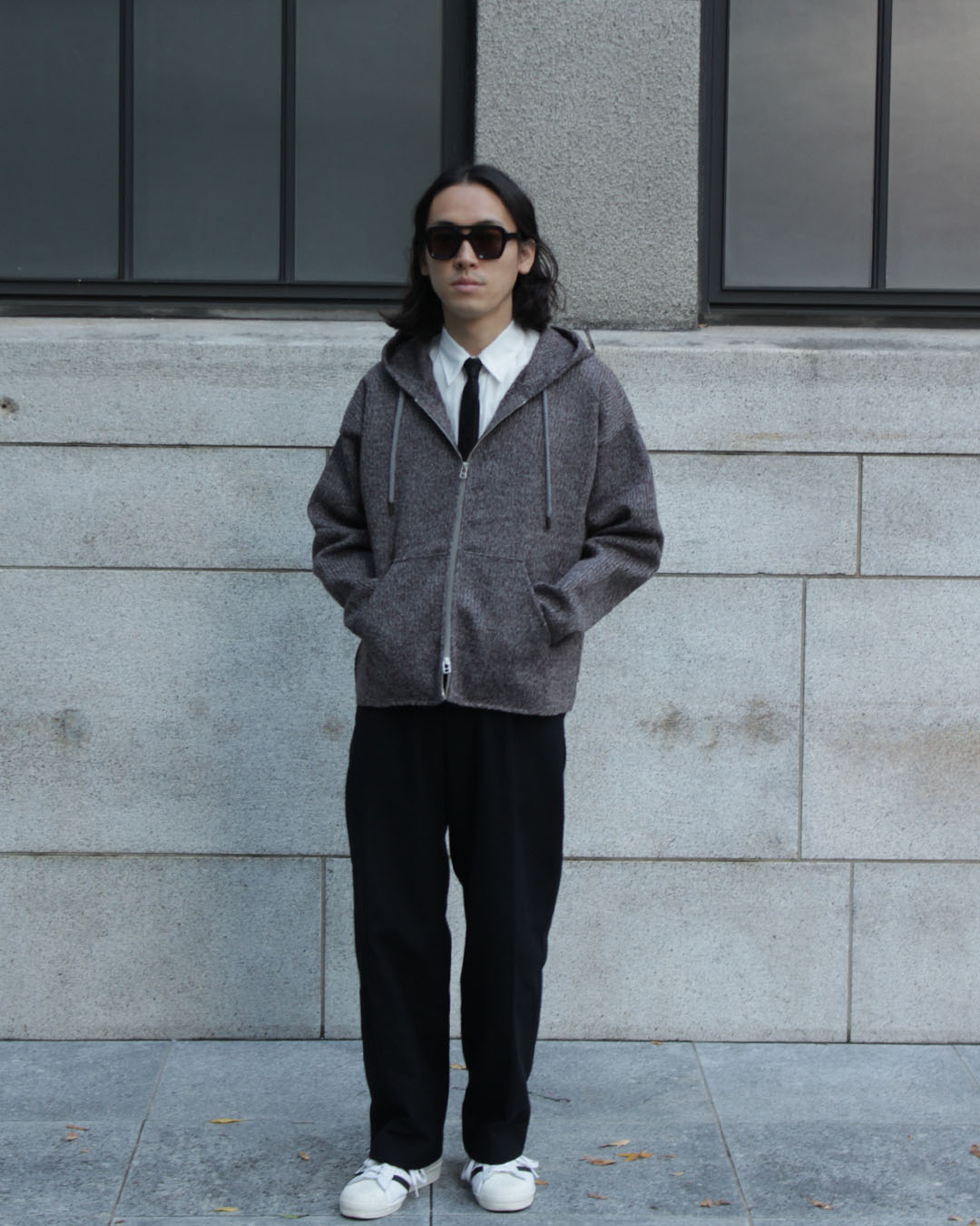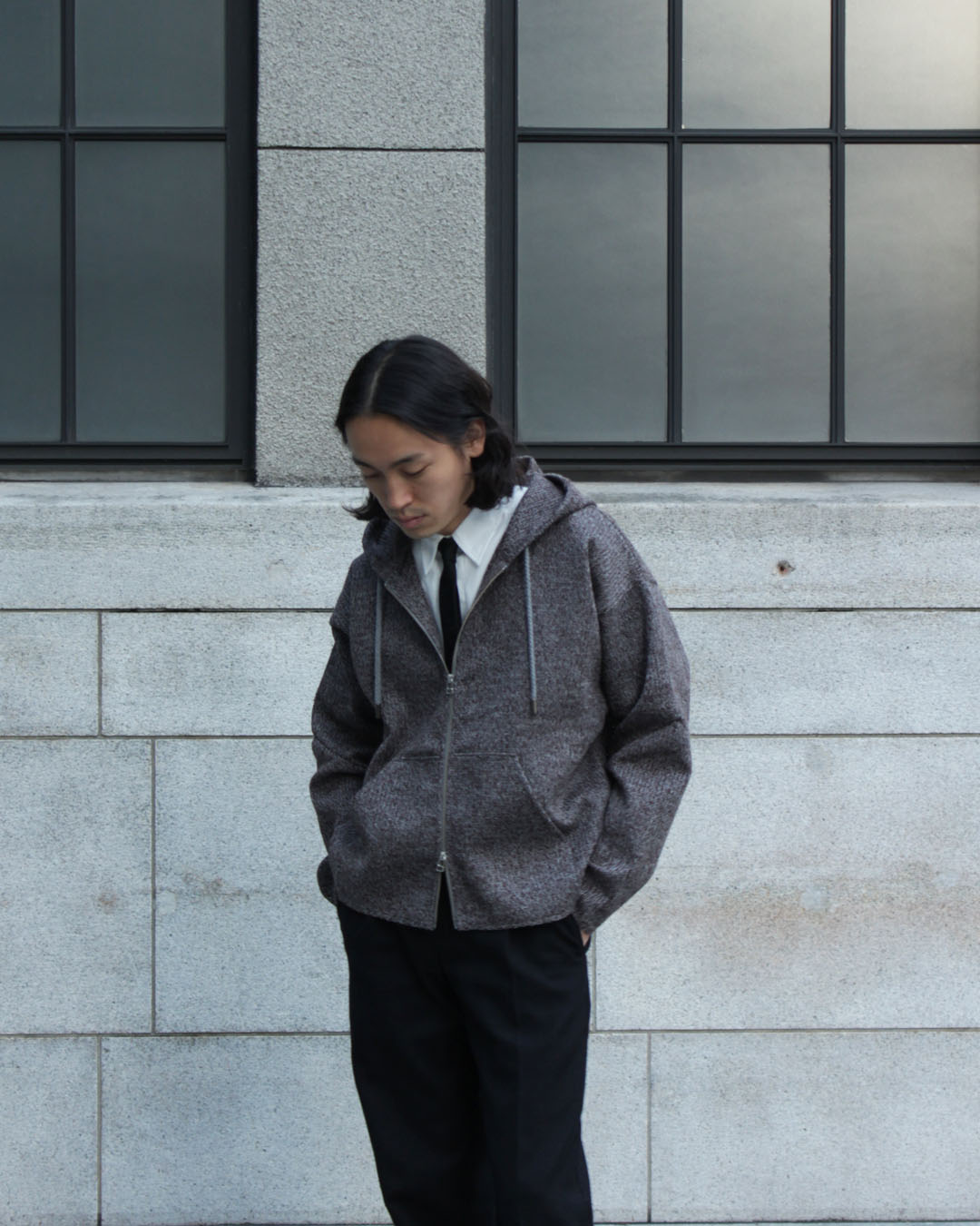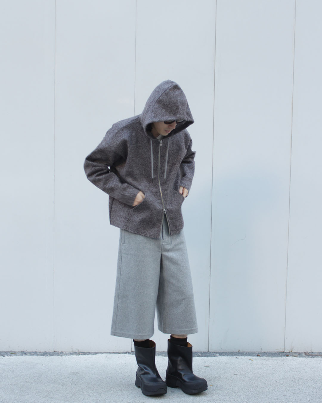 やや広めの裾幅やフードの立ち方など、パーカーというアイテムだからこそアリになる素材感。