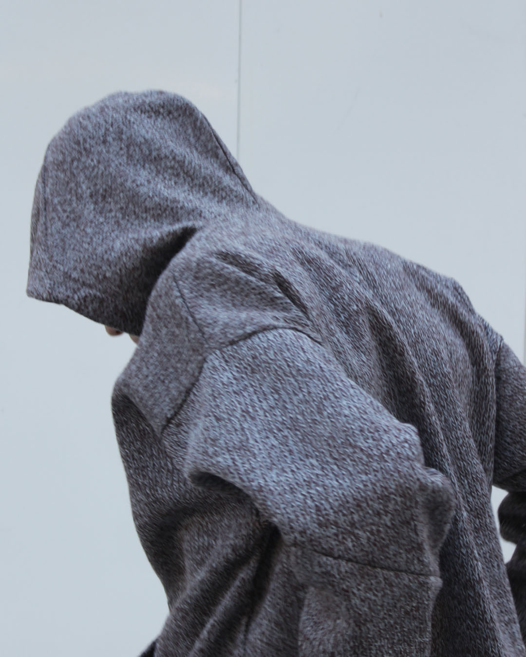 その印象とは裏腹に、ボディーラインに沿わせたり肌当たりを追求したりなどのことは度外視した平面パターンのパーカーなのに、そこに体を通すことによって現れる自然な歪みや立体感はまさに_J.L-A.L_が得意とするデジタルなパターンメイキングにあります。