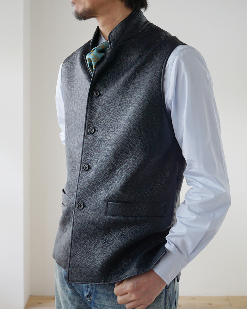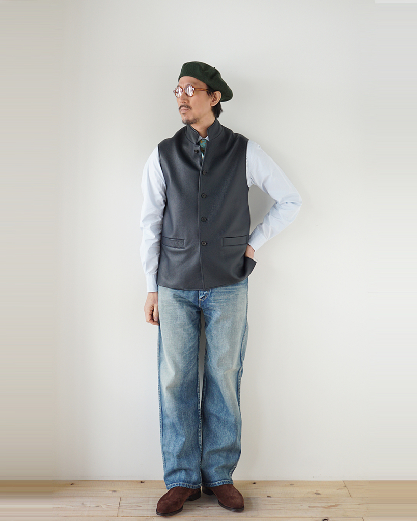 シャツやニットの上から羽織るだけで、スタイルが締まり,ジャケットやコートのインナーに差せば、着こなしに深みが生まれる。軽やかさと重厚さ、そのどちらもを内包した”BRUMAIRE”は,季節をまたいで楽しんでいただけるベスト。