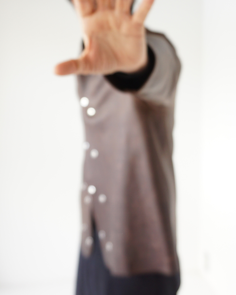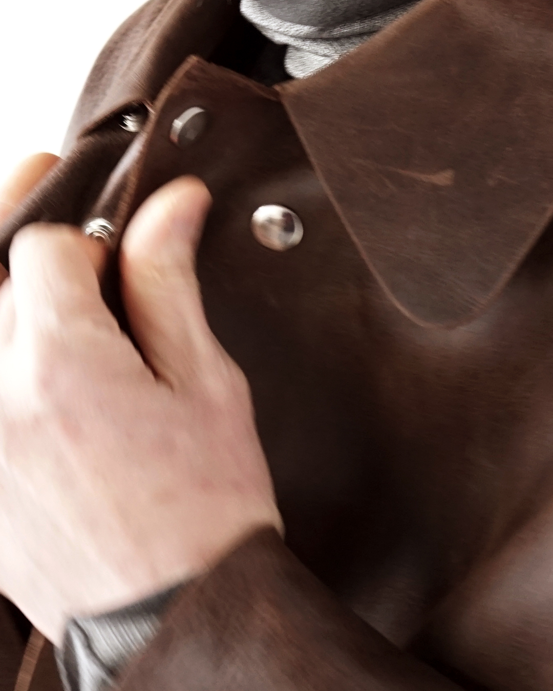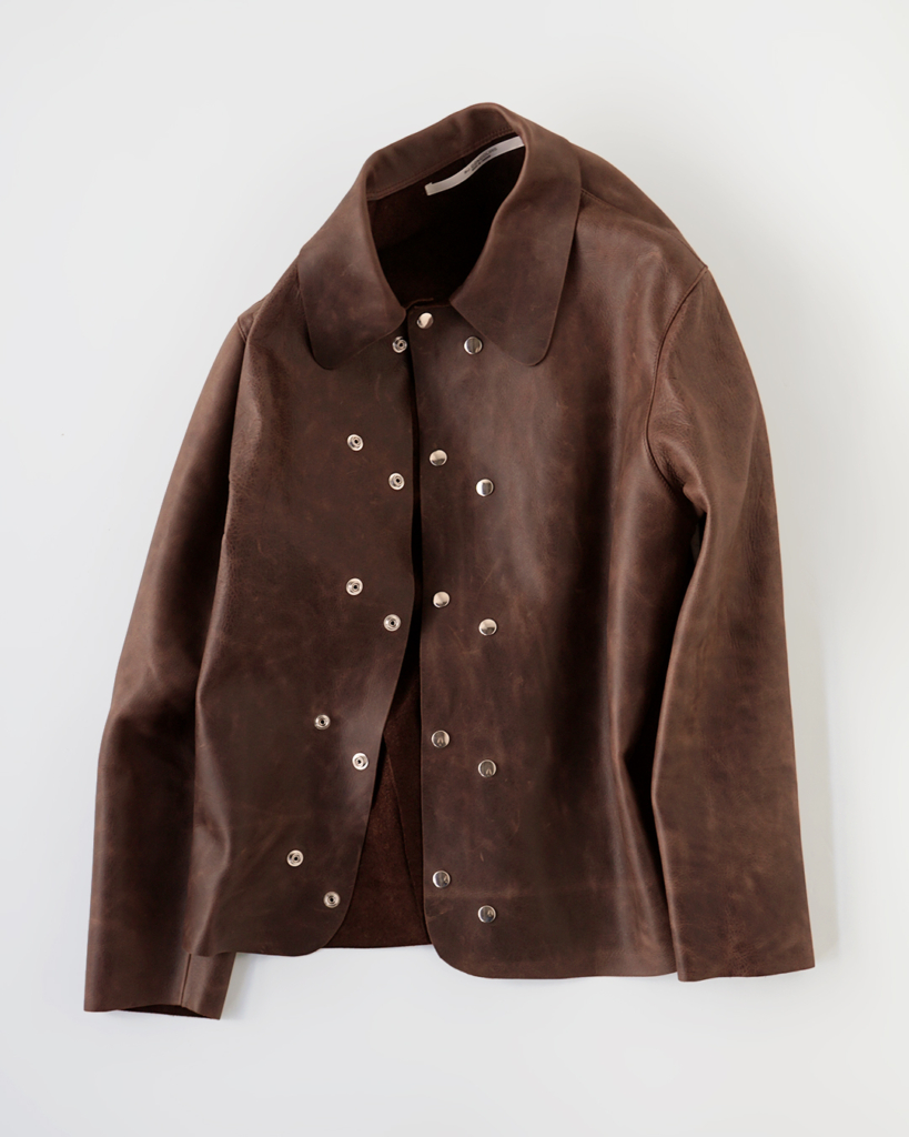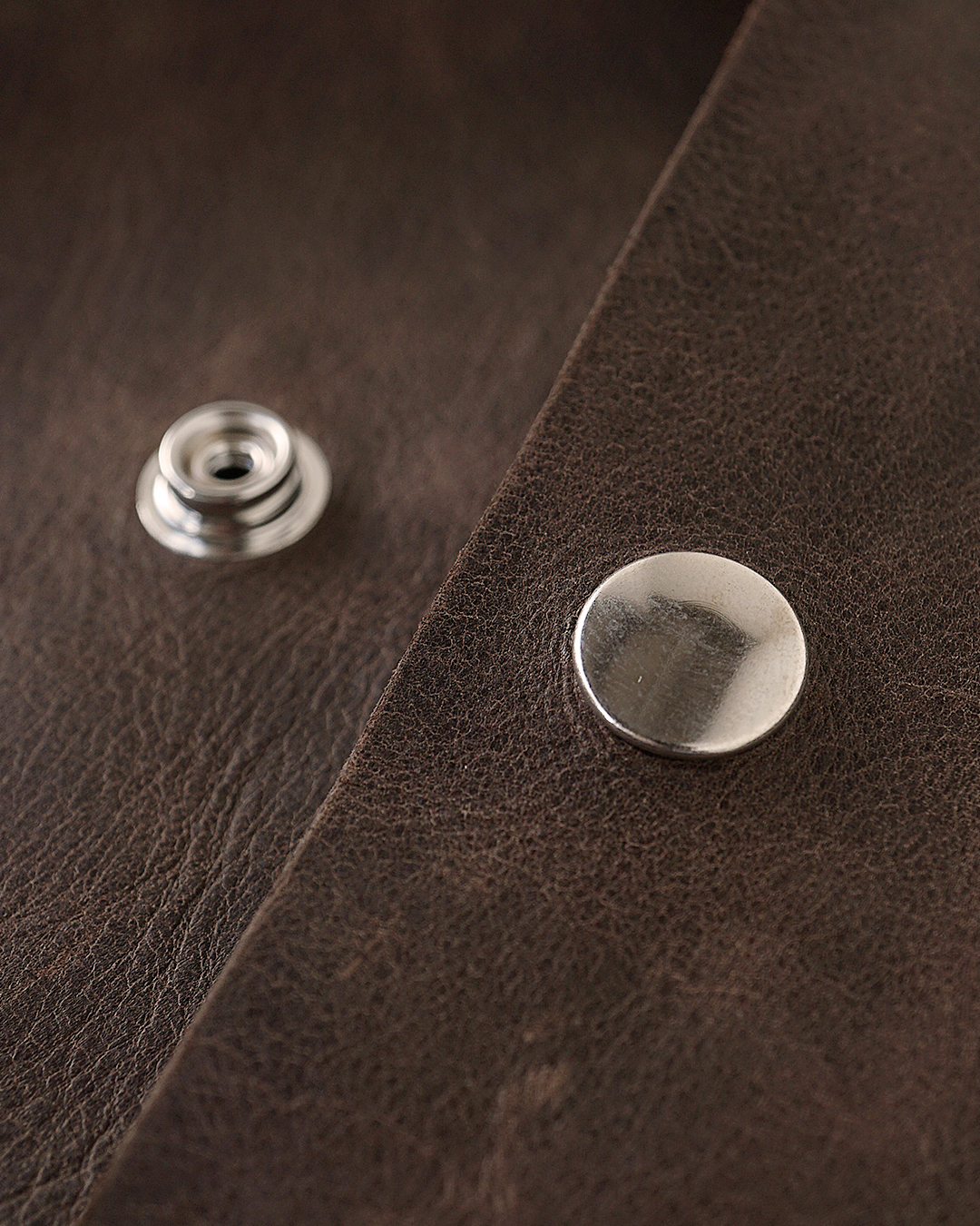無駄なディテールを削ぎ落としたミニマルな佇まいの中に配されたスナップボタンは、レザーのもつナチュラルな風合いと金属特有の無機質な質感とのコントラストを静かに際立たせています。