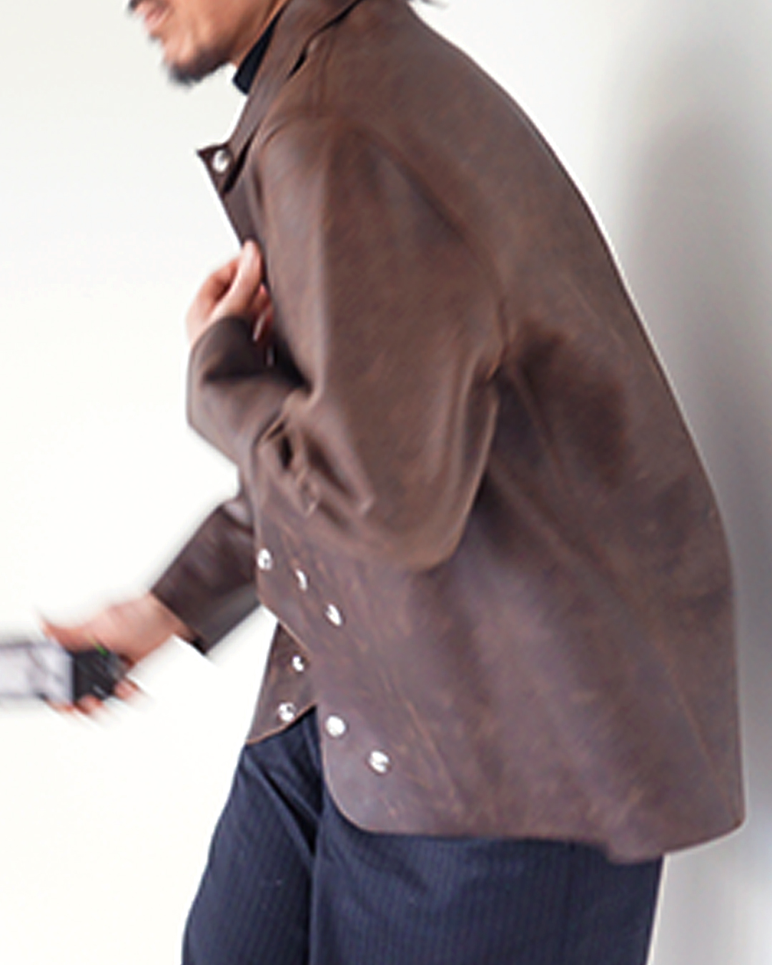 ライニングを配さない仕様と、しっとり柔らかな革質によって生まれるドレープ。これによりモーターサイクルシーンで着用されるようなハードなレザージャケットとは一線を画し,柔らかな印象となる。