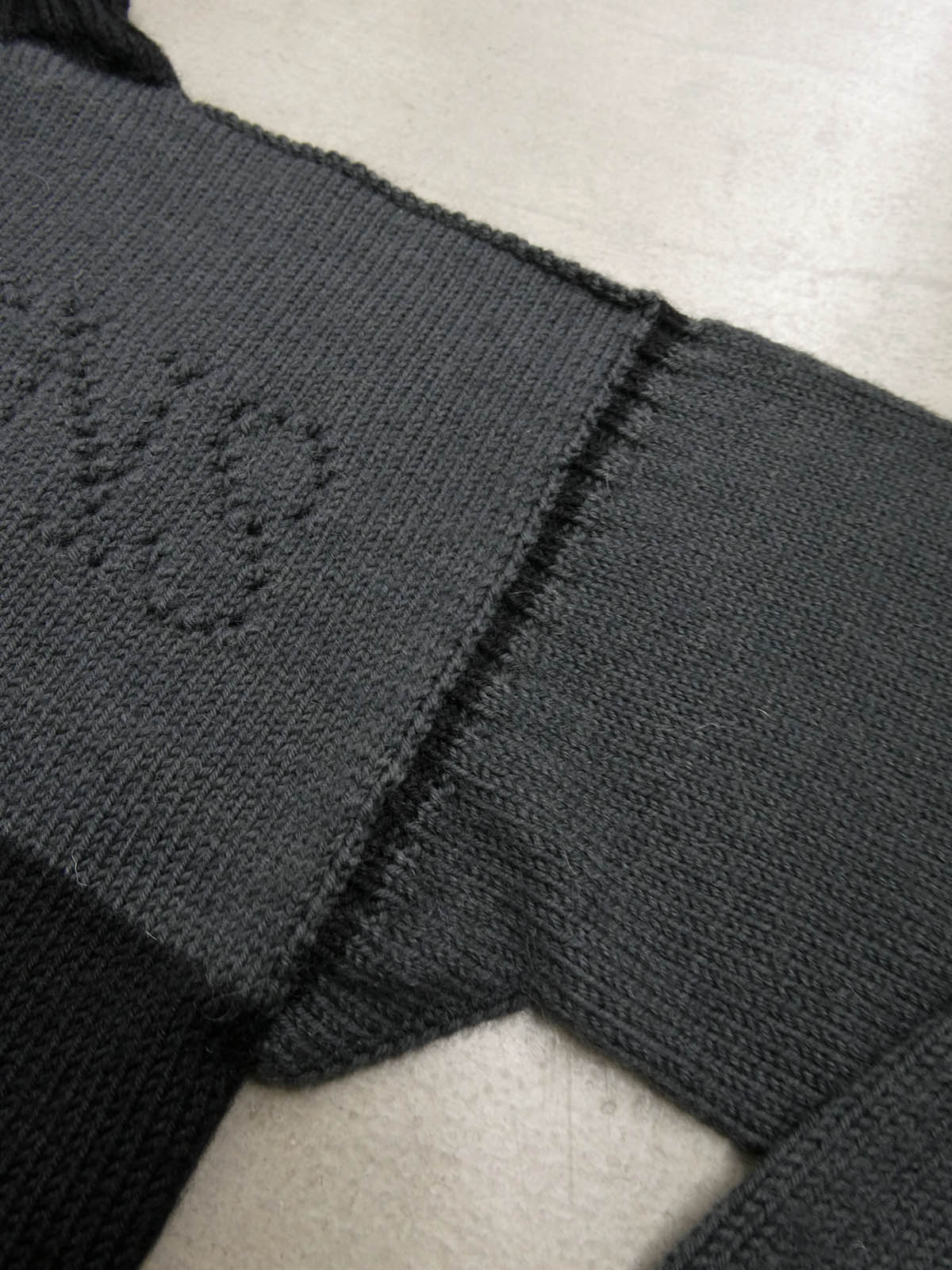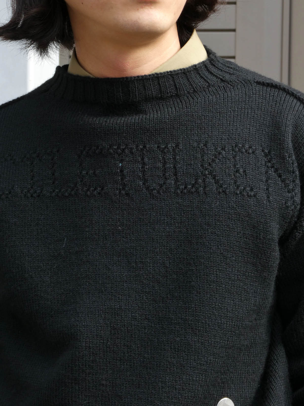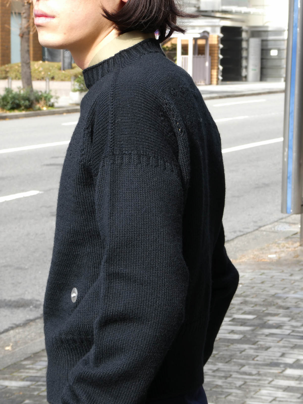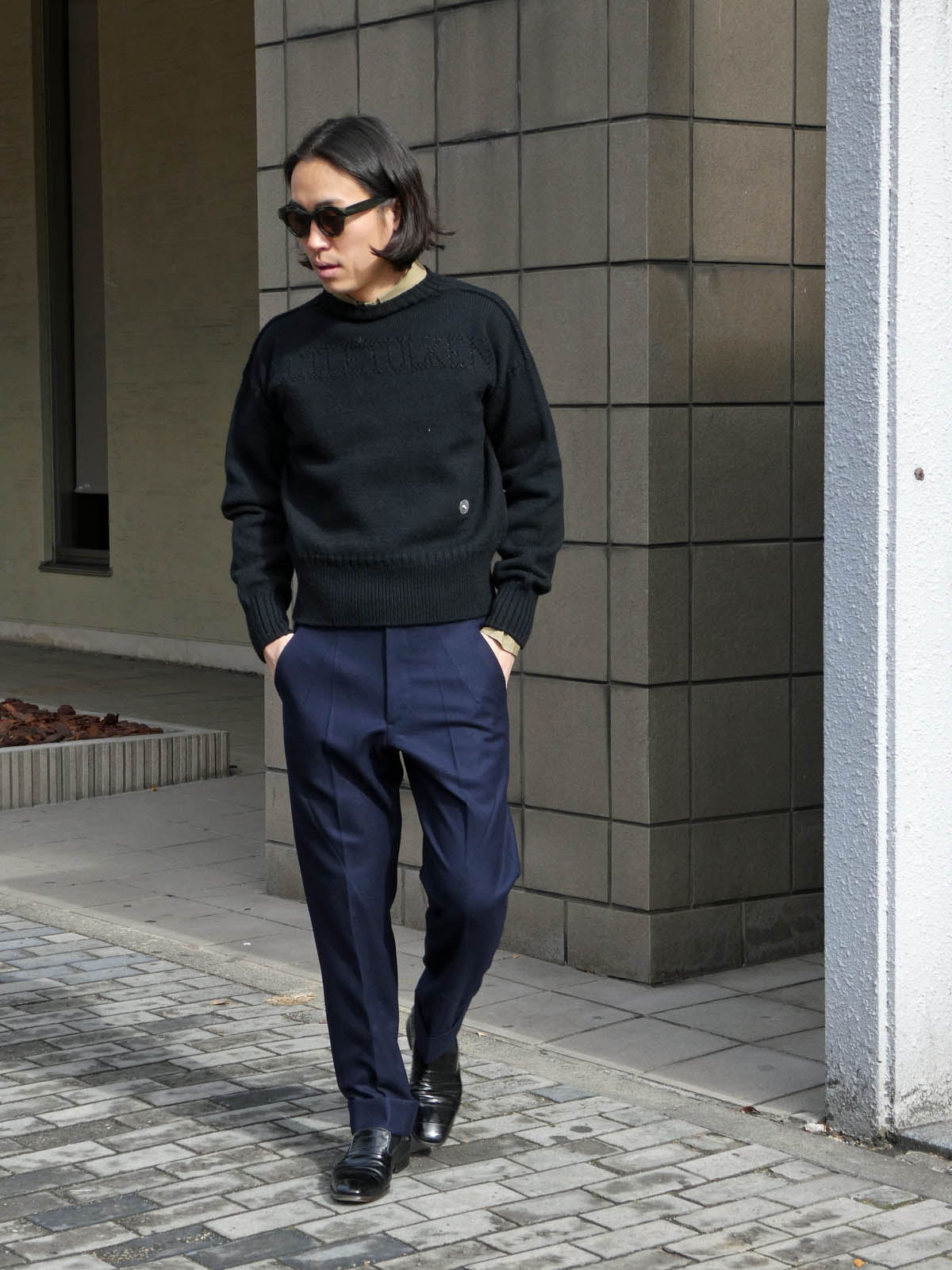 ガンジーセーターは全てのフィッシャーマンズセーターの元になったといわれ、直線で作られたパターン、脇下のひし形ガゼット、暗い船の上で前後が間違えても問題ないように前後ろの区別が無いネックの仕様など、ガンジーセーターの基本的なディテールはしっかり残しつつ、シンプルな肩周りの作り、裾はスリットではなく幅広のリブに変更されているなど、わかりやすい現代的な要素が含まれる仕様。