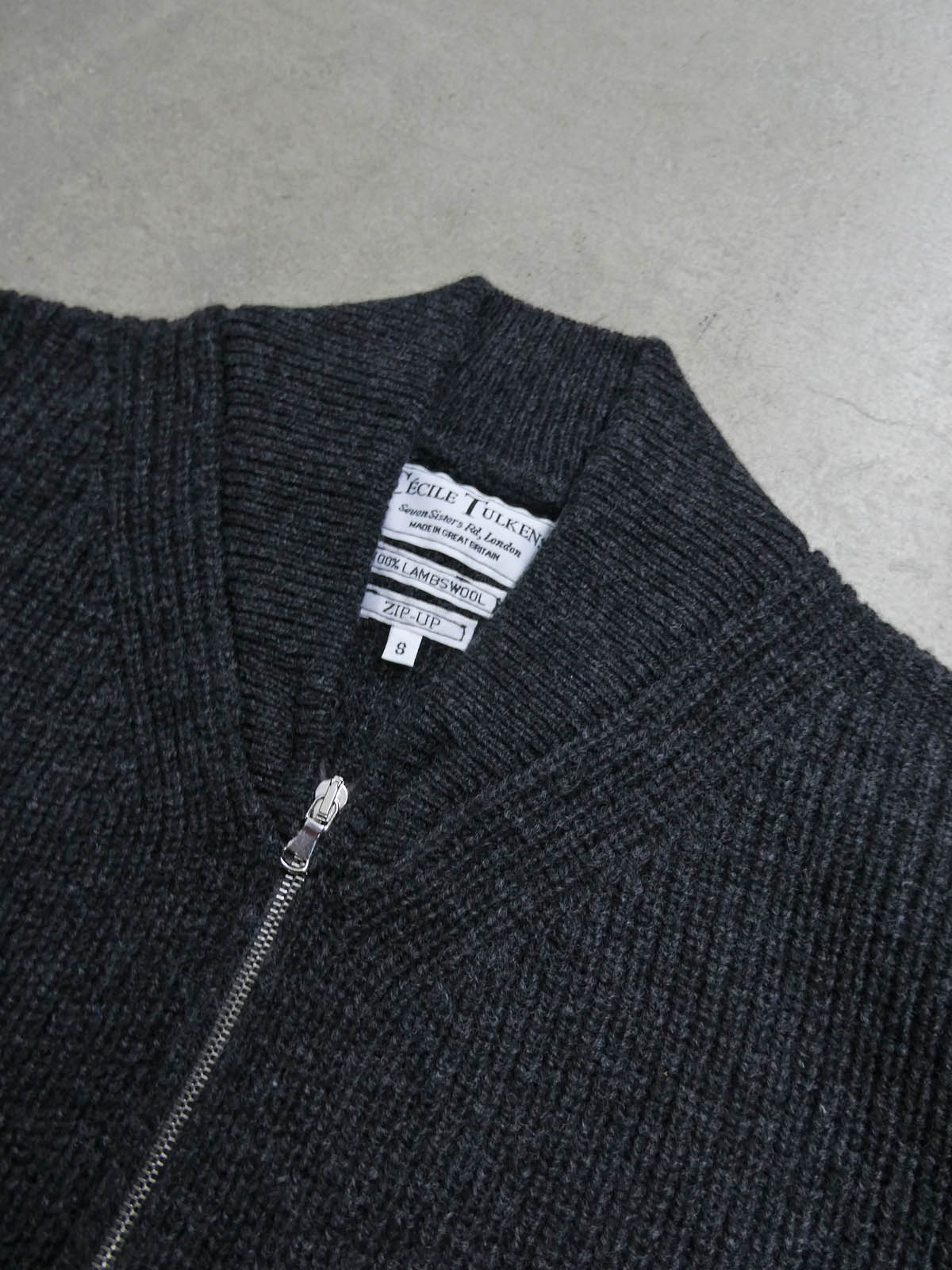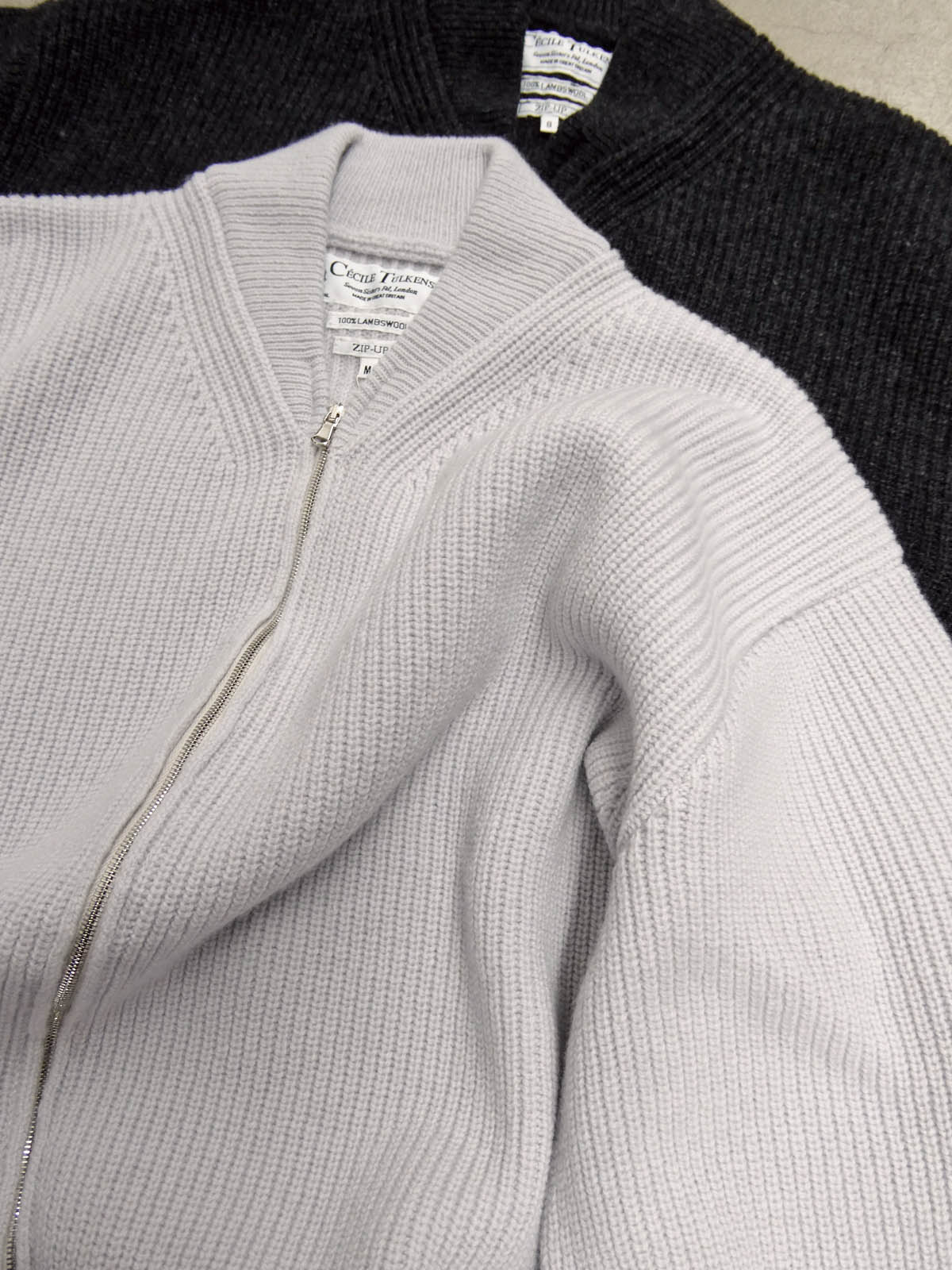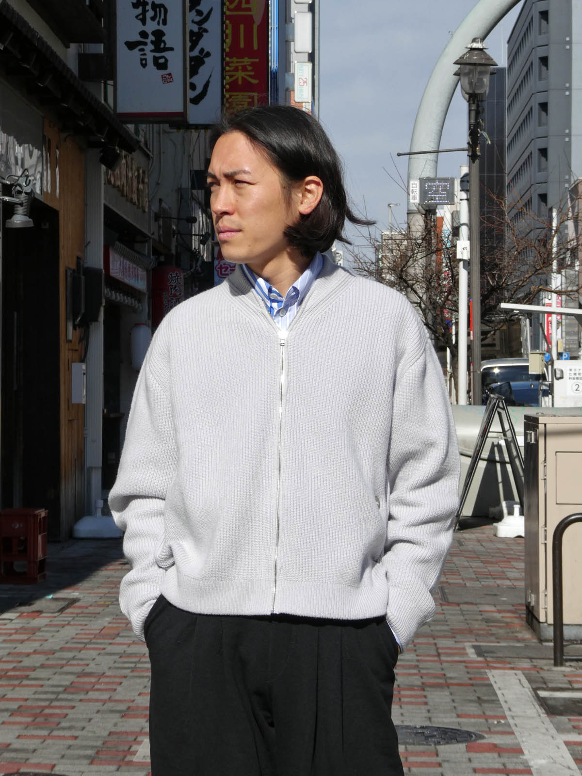 シンプルなジップアップのカーディガン、”LAMBSWOOL ZIP-UP CARDIGAN”。