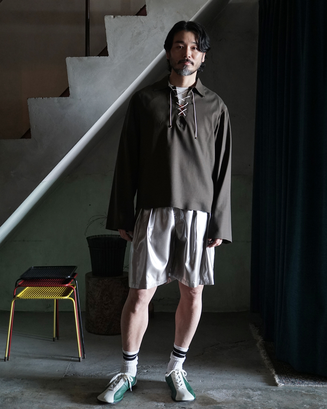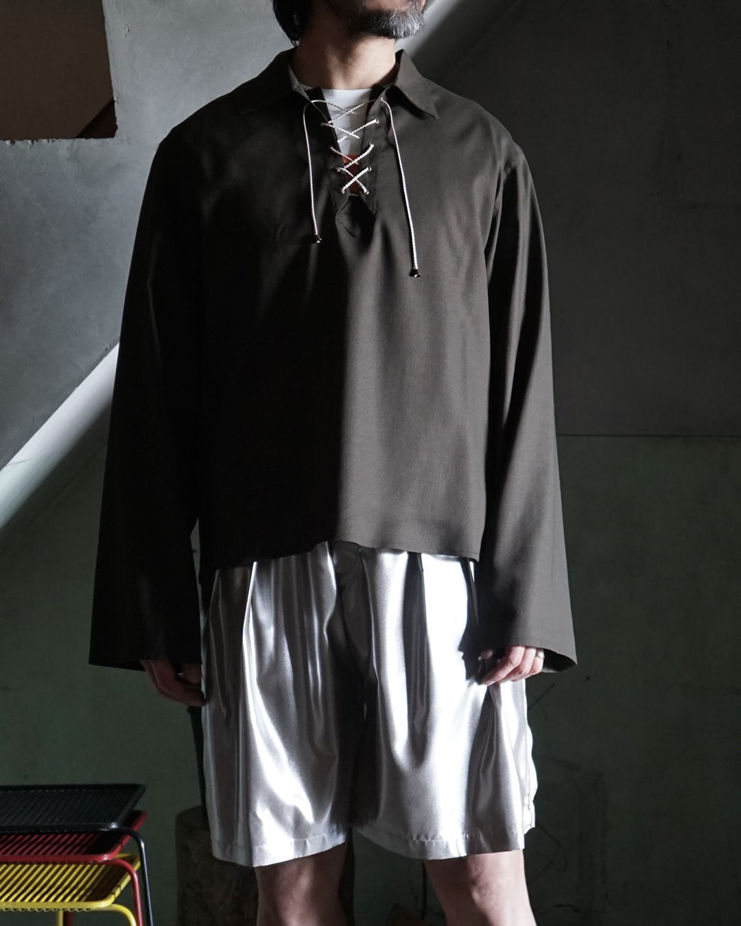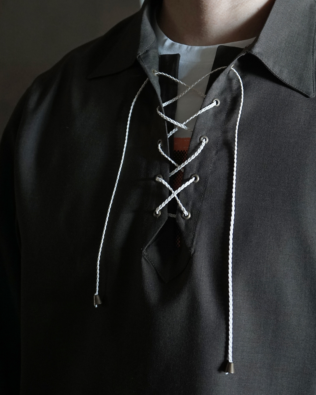 ボクサーMoreauの名を称したこのシャツは、ボクシンググローブを締め上げる紐の構造や、胸元にレースアップディテールのあるヴィンテージのスポーツウエアを着想源に、上質なウール生地で仕立てられています。